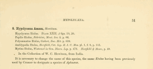 - Nomen novum: Hewitson, W. C. (1862-1863): Specimen of a Catalogue of LycÆnidÆ in the British Museum 1 (text): 1-14, 14a-14h, 15-228, supplement 1-36, systematic index, alphabetical index. London (John van Voorst).
