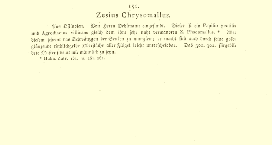 - Erstbeschreibung: Hübner J. (1823): Zuträge zur Sammlung exotischer Schmettlinge [sic], bestehend in Bekundigung einzelner Fliegmuster neuer oder rarer nichteuropäischer Gattungen. Zweytes Hundert: 1-32, 8 unpaginierte Seiten, pl. [36]-[69]. Augsburg.