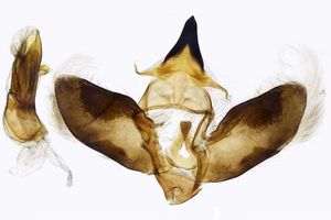 2: überwinternde Raupe in einem Zweig von Mistel (Viscum album austriacum) auf Waldföhre (Pinus sylvestris): Schweiz, Wallis, St-Maurice, 460 m, Peter Sonderegger leg. 3. Februar 1992 (Studioaufnahme: Rudolf Bryner), det. Rudolf Bryner
