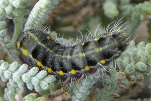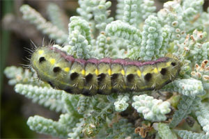 Hofmann & Tremewan (2020: 261) listen in alphabetischer Reihenfolge: "Helichrysum italicum (Roth) G. Don. f., ?Phagnalon sp., Plagius flosculosum (L.) Alavi & Heywood, Santolina chamaecyparissus L. (S. incana Lam.), S. corsica Jordan & Fourr., S. corsica subsp. insularis (Genn. ex Fiori) Zangheri (Hofmann & Tremewan, 1996: 58). In captivity the larvae will feed on Santolina rosmarinifolia L. (W. G: Tremewan, pers. obs.)." Tatsächlich wurden nach den Detail-Ausführungen von Hofmann & Tremewan (2020: 262-263) die meisten Raupen auf Sardinien an "Santolina insularis" gefunden, eine Population lebt aber auch in einem feuchten Tal ausschließlich an Plagius flosculosus. Das aktuelle Vorkommen auf Korsika scheint ganz an Helichrysum italicum gebunden zu sein, da Santolina corsica dort nur randlich in ganz wenigen Einzelpflanzen gefunden werden konnte. Die Herkunft der fraglichen Meldung zu Phagnalon sp. wird leider nicht erklärt.
