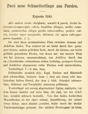 - Erstbeschreibung: Christoph, H. (1882): Zwei neue Schmetterlinge aus Persien. — Horae societatis entomologicae rossicae 17 (1/2): 123-126. St. Pétersbourg (V. Bésobrasoff & Comp.). [Digitalisat auf biodiversitylibrary.org]