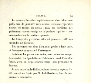 - Erstbeschreibung: Boisduval, J. A. (« 1829 ») [1828]: Essai sur une monographie des zygénides, suivi du tableau méthodique, des lépidoptères d'Europe. 1-150, pl. 1-8. Paris (Méquignon-Marvis).