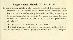 Kann es sein, dass Herr Nickerl die Art nach sich selbst benennt? Ja, aber - ein bisschen komplizierter ist es. Damals akzeptierte man durchaus auch noch in-litteris-Namen, also solche, denen keine Publikation im Sinne des ICZN zugrunde lag. Nickerl hatte Tiere gesammelt, Herrich-Schäffer sie als neue Art erkannt und sie im Brief dann Herrn Nickerl gewidmet. Nickerl (1864) konnte daher schreiben: "Stagmatophora Nickerlii H.-Sch. in litt. [...] Die Art, welche Herr Dr. Herrich-Schäffer nach mir benannt, wurde von mir im verflossenen Jahre in einzelnen Exemplaren in der Umgebung Prags gefunden“.