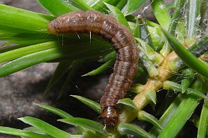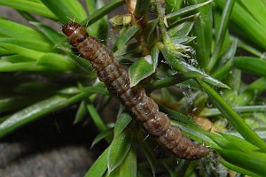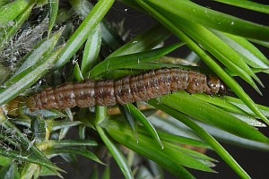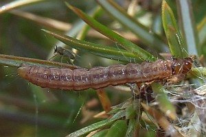 1: vorletztes Stadium, Deutschland, Thüringen, Bad Blankenburg, Waldsaum mit Magerrasen, an einzeln stehendem Wacholderbusch (Juniperus communis), 20. April 2008 (manipuliertes Freilandfoto: Heidrun Melzer), det. Heidrun Melzer