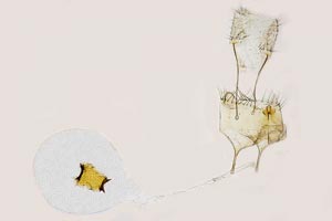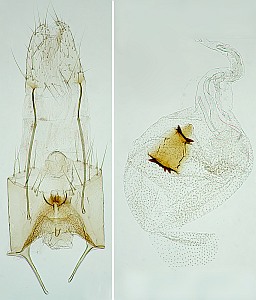 2-4: Genitalpräparat eines nicht abgebildeten ♀, Deutschland, Baden-Württemberg, 78176 Blumberg, Ortsrandlage, Südhang, in Waldnähe (Buchen-Mischwald, Waldrand mit anschließendem Trespen-Halbtrockenrasen auf Kalk), 720 m, am Licht, 3. August 2017 (leg., gen. det., Präparation und Foto: Hans-Peter Deuring)Forum
