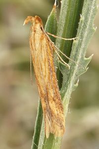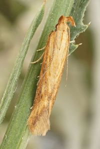 Noch unbekannt! Es gibt allerdings einen Hinweis. Gastón & Huemer (2022: 325) schreiben dazu: "A record of rearing M. subflavella from the seed-heads of Klasea baetica Cass., in F. Cuvier in Portugal (CORLEY, 2005) possibly refersto the new species."