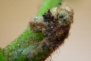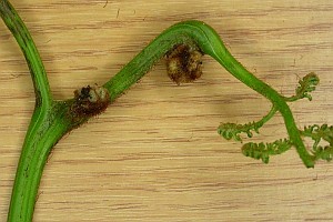 1-4: Stängelverdickungen und unförmiger Wuchs mit verkümmerten Farnwedeln, Deutschland, Thüringen, Waldweg östlich "Grafenstein" 3 km südwestlich Langenfeld bei Bad Salzungen, Raupen am 20. Mai 2014 mit Adlerfarn (Peridium aquilium) eingetragen (leg., cult., det. & fot. am 22. Mai 2014: Uwe Büchner)Forum