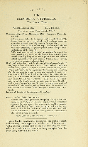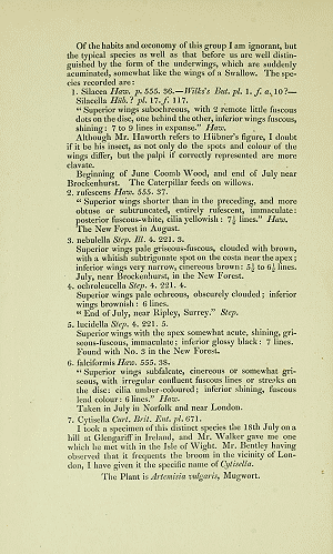 - Erstbeschreibung: Curtis, J. (1823-1840): British Entomology; Being Illustrations and Descriptions of the Genera of Insects Found in Great Britain and Ireland: Containing Coloured Figures from Nature of the Most Rare and Beautiful Species, and in Many Instances of the Plants upon which they are Found. Vol VI. Lepidoptera, Part II. — [Not paginated]. London (E. Ellis & Co.).