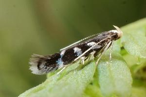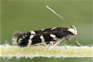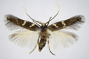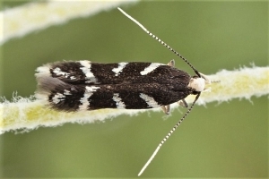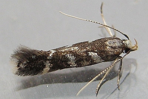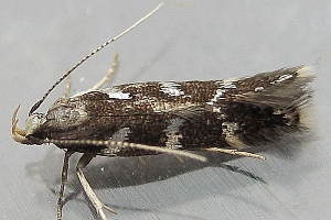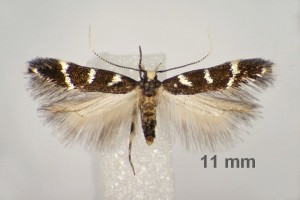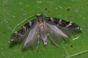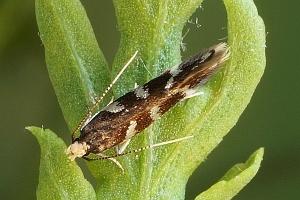 Bei E. wilkella sind die silbrig glänzenden Vorderflügelflecken zu drei Binden verschmolzen. (Helmut Deutsch)