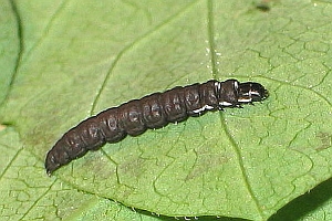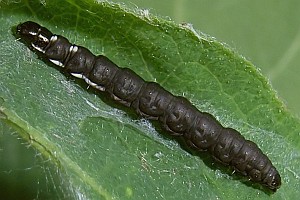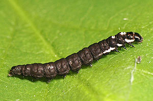 10: Deutschland, Niedersachsen, Region Hannover, Stadt Sehnde, Ortsteil Höver, Waldgebiet Gaim, feuchter Waldweg, Raupe an Lonicera xylosteum 6. Mai 2017, Falterschlupf 2. Juni 2017 (cult., det. & fot.: Tina Schulz)