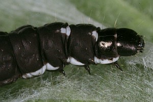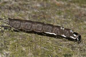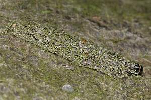 8-9: Deutschland, Niedersachsen, Stadt Rodenberg, Ortsteil Algesdorf, größeres Feldgehölz mit Teich im Inneren, 70 m, Raupe an Lonicera xylosteum 14. Mai 2017, Falterschlupf 2. Juni 2017 (cult., det. & fot.: Tina Schulz)