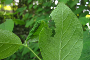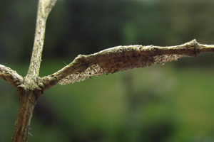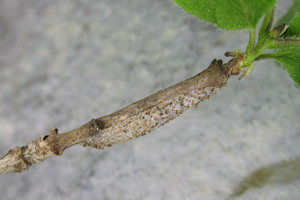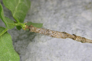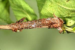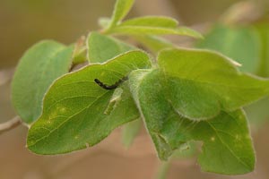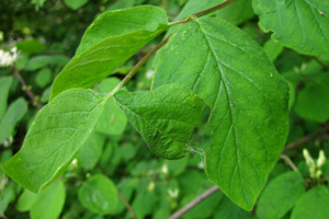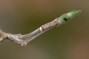 2: Raupengespinst an Heckenkirsche (Lonicera spec.): Deutschland, Sachsen, Leipzig, Stadtpark, 11. Mai 2007 (Foto: Heidrun Melzer), leg., cult. & det. Heidrun Melzer