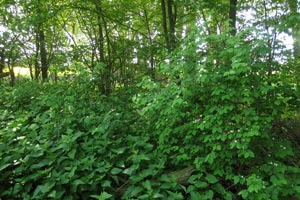 2: Deutschland, Niedersachsen, Stadt Rodenberg, Ortsteil Algesdorf, größeres Feldgehölz mit Teich im Inneren, stark beschattete Lonicera xylosteum, 70 m, 14. Mai 2017 (Foto: Tina Schulz)