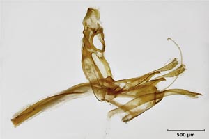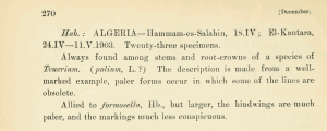 Walsingham (1904: 269) hatte geschrieben: "Type, ♂ (96479); ♀ (96480). Mus. Wlsm." Pitkin (1984) legte dieses Männchen - mit Etikettendatum 5. Mai 1903 - als Lectotypus fest: "I have examined 9 ♂, 9 ♀ from El Kantara and designate as lectotype the specimen bearing Walsingham's number 96479."