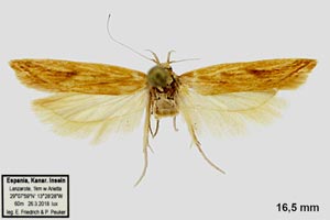 Die Art fehlt bei Huemer & Karsholt (1999), da sie nicht aus Europa bekannt war. Die beiden gezeigten Tiere vom 25. und 26. März 2018 und 2 weitere nicht abgebildete Falter wurden von E. Friedrich und P. Peuker auf Lanzarote gesammelt und von H. Strutzberg determiniert; dabei handelt es sich offensichtlich um den ersten Nachweis der Art für die Kanarischen Inseln und damit für Europa i.w.S. Huemer & Karsholt (2020) nahmen sie versehentlich nicht in ihre Checkliste der Gelechiidae Europas auf.