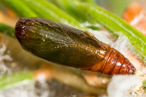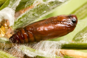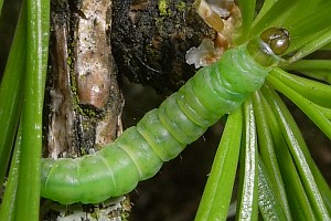 Die Raupe lebt wahrscheinlich ausschließlich an Lärchen, was vielfach bestätigt wurde.