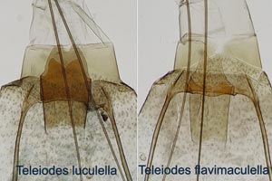 Die Ausdehnung des orangen Flecks ist bei T. luculella meist eher klein, aber das variiert. Die Form des Flecks ist entscheidender: Der ist bei T. luculella immer c-förmig und berührt den Vorderrand, während er bei T. flavimaculella wohl nie den Vorderrand berührt und in Richtung basalen Flügelteil sehr dünn wird (Maurizio König im [Forum], leicht abgewandelt). Bei älteren Faltern von T. flavimaculella können die orangen Schuppen fehlen, der Fleck wird weißlich.