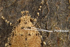 Die Vorderflügelfärbung, die Ausprägung der paarweise angeordneten schwarzen Punkte sowie das Vorhandensein und die Intensität dunkler und weißlicher Schuppen sind recht variabel. Ein anscheinend konstantes Merkmal befindet sich auf dem Thorax und kann bei gut erhaltener Thoraxbeschuppung zur Unterscheidung von der ansonsten sehr ähnlichen Carpatolechia aenigma herangezogen werden: Der Thorax weist 4-5 schwarze Schuppenflecke auf, wobei der hintere (mittige) Punkt gelegentlich fehlen kann. Das vordere Punktpaar (siehe Markierung im Bild unten) ist bei P. paripunctella deutlich ausgebildet, während es bei C. aenigma fehlt oder nur sehr schwach angedeutet ist. Die Hinterflügel sind bei beiden Arten grau und helfen nicht bei der Unterscheidung. Eine sichere Bestimmung ist durch Genitaluntersuchung gewährleistet. (Heidrun Melzer)