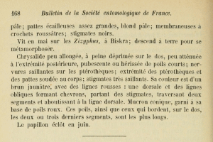 Chrétien (1908: 167-168) lieferte eine ausführliche Beschreibung der Raupe, fasste sich bei der Biologie aber kurz: "Vit en mai sur les Zizyphus, à Biskra; descend à terre pour se métamorphoser." Die Raupen waren im Mai offensichtlich ausgewachsen, denn der Falter schlüpfte im Juni.