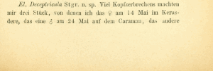 - Erstbeschreibung: Staudinger, O. (1879-1880 [159-368: 1879; 369-435: 1880]): Lepidopteren-Fauna Kleinasien's. — Horae societatis entomologicae rossicae 15: 159-435. St. Pétersbourg (V. Besobrasoff & Comp.).