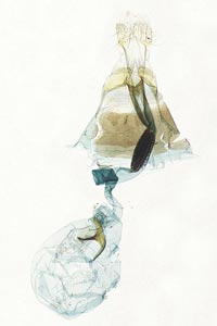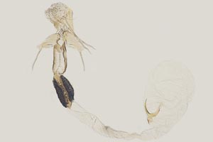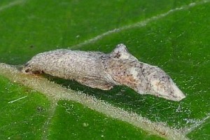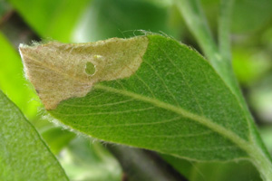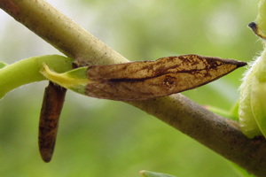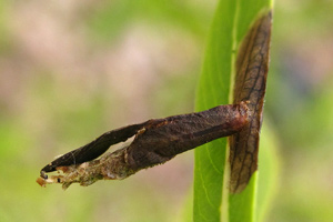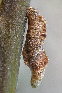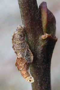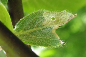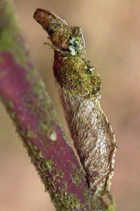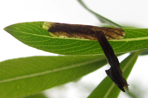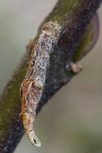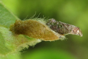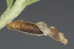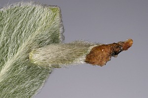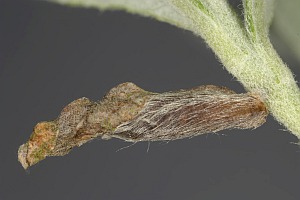Hinweis: Der unterste Sackteil wird nach der Überwinterung angefügt. Je nach Weidenart und je nachdem, ob man den Sack von der Seite betrachtet, die die ehemalige Blattober- oder Blattunterseite zeigt, variiert dessen Behaarung beträchtlich. So blickt man beim Sack von Bild 2 auf die sehr stark behaarte ehemalige Blattunterseite der Salweide, bei Bild 3 auf die nur mäßig behaarte Blattunterseite der Purpurweide, bei Bild 4 auf deren kahle Blattoberseite (aufgrund der Zuchtbedingungen hier aber an Salweide sitzend!).