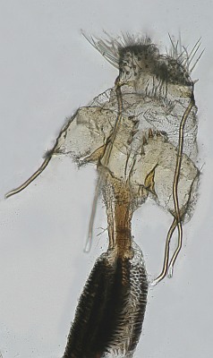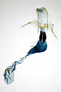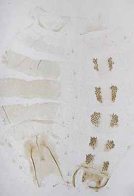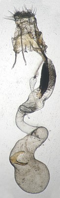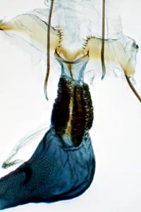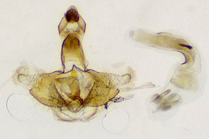 1-3: Präparat des als Beleg abgebildeten ♂, Pfalz, coll. NHMW (Präparation und Mikro-Fotos: Peter Buchner), [1] herkömmliche Einbettung, [2] Foto der nicht eingebetteten Genitalarmatur, v.a. zwecks Darstellung des Phallus-Apodems, [3] Abdomenhülle