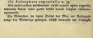 - Beschreibung als Coleophora metallicella: Fuchs, A. (1903): Neue Kleinfalter des Mittelmeergebiets. — Entomologische Zeitung 64 (1): 3-16. Stettin. [Digitalisat auf biodiversitylibrary.org]