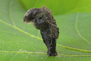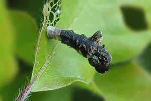 Schütze (1931) trägt zusammen: "Zuerst minierend, dann Löcher in die Blätter fressend, wobei an der Eiche die Rippen stehen bleiben (Sorhagen). Der Pistolensack ist schwarz, unten scharfkantig, vorne verengt, hinten fast rechtwinklig abwärts gebrochen, mit zwei blasigen, den After unter umfassenden Seitenlappen über welchen am Rücken zwei seitwärts gerichtete ohrartige Anhängsel stehen (Heinemann). Auch an Carpinus, Corylus, Fagus, Salix, Prunus cerasus, Pirus malus [Malus domestica] und Pirus comunis [Pyrus communis agg.] (Sorhagen)."