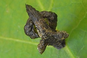 Die Frassspuren sind bei dieser Art sehr speziell: Die Raupe verursacht keine Minen, wie sie für die meisten andern Coleophora-Arten typisch sind, sondern hinterlässt an den Buchenblättern einen filigranen Fensterfrass (Bild 1). [Rudolf Bryner]