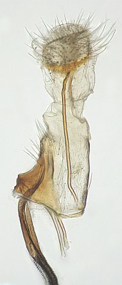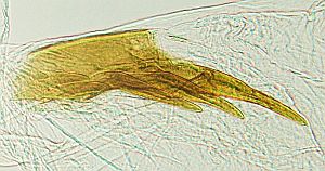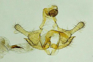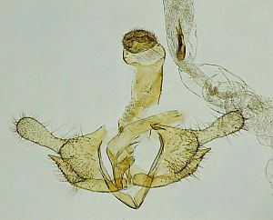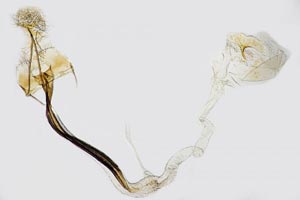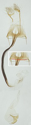 Ein wichtiger Unterschied in den weiblichen Genitalien von Coleophora mareki gegenüber C. serpylletorum und C. chamaedriella liegt in der Form des Vorderrandes des Sterigmas: Gerade bei Coleophora mareki, konkav bei den beiden anderen Arten. Dieser Bereich im Einschub in Bild 1 rot markiert (Text: Peter Buchner, nach der in der Originalbeschreibung angegebenen Merkmalsgegenüberstellung).
