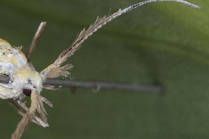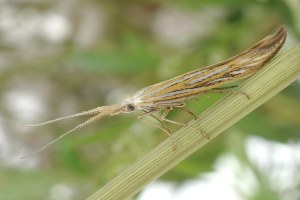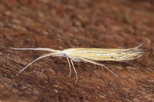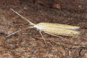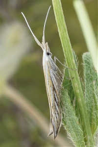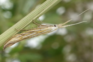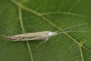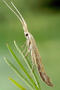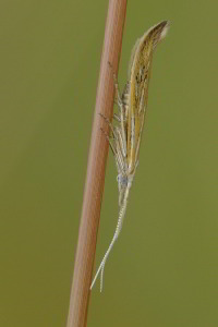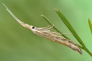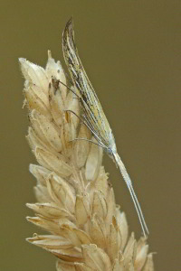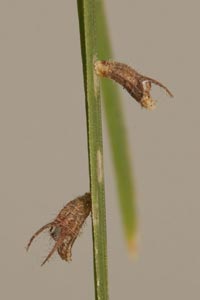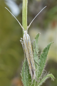 Coleophora ornatipennella und Coleophora lixella weisen eine "gesichelte" Flügelspitze auf.