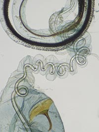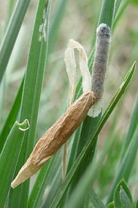 Bild 1 zeigt die Raupe außerhalb ihres Sacks bei der Nahrungsaufnahme in der Grasmine.