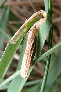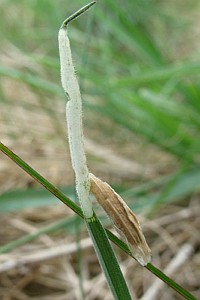 Anmerkung: Die Weiterzucht der oben gezeigten Raupen verlief nicht erfolgreich und es wurden keine Falter erzielt. Die Raupensäcke sind nach Auskunft von Jukka Tabell nicht von denen der verwandten Art Coleophora lixella unterscheidbar. Lediglich das frühe Funddatum im April lässt auf Coleophora ornatipennella schließen. Insofern ist die Bestimmung nicht 100%ig abgesichert.