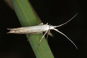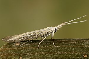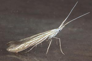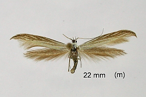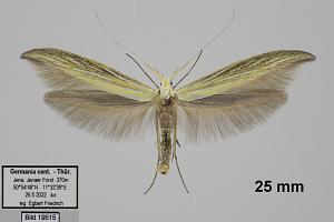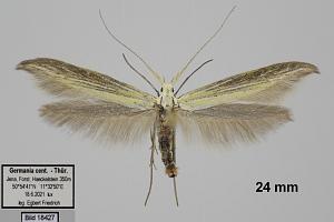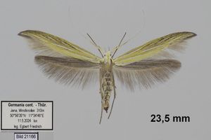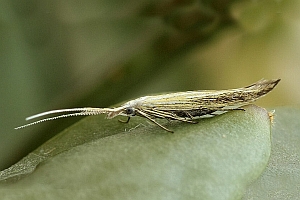 Coleophora ornatipennella und Coleophora lixella weisen eine "gesichelte" Flügelspitze auf.
