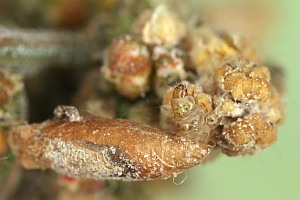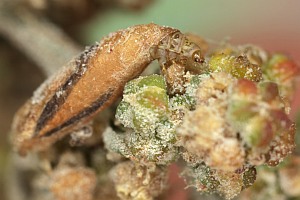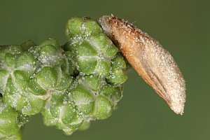 Gut als Raupennahrung abgesichert zu sein scheint mir nur der Weiße Gänsefuß (siehe Bilder oben). Wahrscheinlich werden auch noch andere Chenopodium-Arten genutzt, aber konkrete Nennungen fehlen. Schon schrieb: "Raupe August bis Mai [...] An den Samen von Chenopodium, bis Mai an Zäunen umherlaufend. Verwandlung daselbst oder unter Baumrinde gesellig. Röhrensack staubgrau, ins Bräunliche ziehend, dem der virgaureae an Gestalt ähnlich, aber größer und griesig. Afterende dreiklappig, Mund vertikal (Sorhagen)." Bei Angaben zu Atriplex ist Verwechslung mit anderen Arten in Betracht zu ziehen.