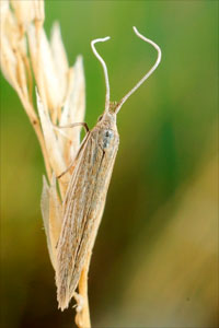 Wikström & Tabell (2016) schreiben dazu: "The larva feeds on the seeds of Solidago virgaurea from late July to September, sometimes to October, usually together with the larvae of C. virgaureae. The larval case (Fig. 3) is similar to that of C. virgaureae, 5-6 mm, subcylindrical, trivalved, made of brown silk and covered with fine filaments of pappus."