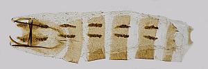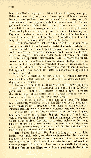 Hofmann (1869) beschrieb nicht nur den Falter, sondern lieferte auch detaillierte Angaben zur Morphologie und Lebensweise der Raupe: "Ich entdeckte die Raupe in einem schattigen Wäldchen bei Marktsteft, woselbst sie an den Blättern des Chrysanthemum corymbosum minirt, und zwar meist an den Spitzen der Fiederblättchen, welche dadurch weißlich entfärbt werden. Sie findet sich im Juli, manchmal noch Anfang August, hört aber schon meist Ende Juli zu fressen auf und sucht sich einen passenden Versteck an Baumstämmen etc. auf, woselbst sie ihren sack festheftet und, ohne mehr eine Nahrung zu sich zu nehmen, überwintert. Im Frühjahr erfolgt dann gleich die Umwandlung zur Puppe [...]."