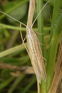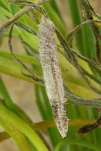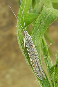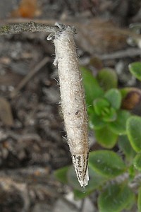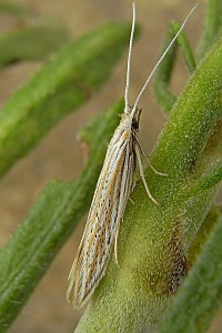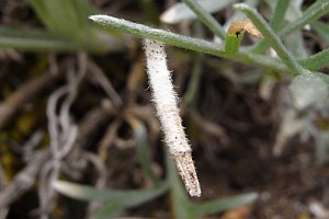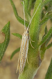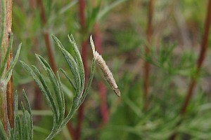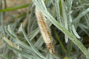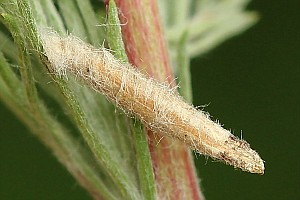 Schon Herrich-Schäffer ([1854]: Tineides pl. 110 fig. 887) meldete in seiner Erstbeschreibung: "Der Sack ist lang, hinten scharf zugespitzt, indem die drei Klappen lanzettförmig sind, ohne aufgebogene Ränder. Man sieht in der graugelben Grundfarbe jederseits einen oder zwei braunere, gerade, breite Längssstreifen, welche aber in den vorderen zwei Dtrittheilendurch wollige Querfasern mehr versteckt sind. Die Raupe lebt im Mai und Juni an Artemisia campestris und entwickelt sich im Juli u. August." Auch Schütze (1931: 191) nennt Artemisia campestris als einzige Nahrungspflanze, wobei er sich aber auf nichteigene Beobachtungen beruft. Hering (1957: 121-122) führt hingegen Artemisia vulgaris als einzige Nahrungspflanze an - ob es dafür einen konkreten Beleg gibt, ist mir unklar. Quelle für die Meldung könnte Hering (1931) sein - eine Arbeit, die ich noch nicht einsehen konnte.