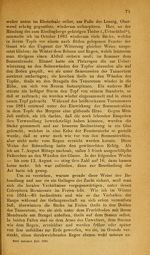 Schon Fuchs (1886) sammelte die Raupen-Säcke in großer Anzahl im Herbst auf den getrockneten Fruchtständen des Rainfarns, also an Wegrändern und in Brachen. Wo die Art vorkommt, ist sie - wenn man sich erst einmal eingeschaut hat - leicht zu finden. An der selben Pflanzenart leben auch die Raupensäcke der weiter verbreiteten Coleophora tanaceti.