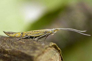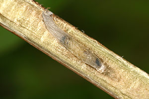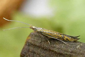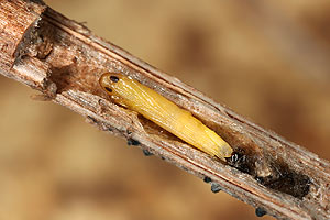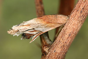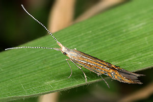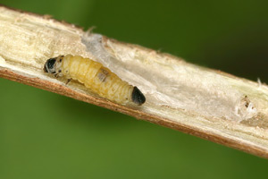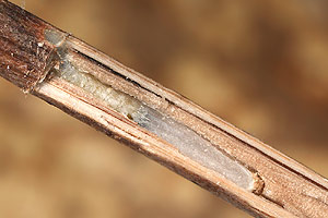 Vor der Überwinterung leben die Raupen in einem Sack, welcher aus einem Blütenkelch des Strandflieders (Limonium vulgare) gebildet wird. Gemäss Literatur ernährt sich die Raupe von den Samen der Pflanze. Anfang Oktober waren alle Raupensäcke bereits verlassen (siehe Befallsbild 2). Die Raupen hatten sich in die Blütenstengel des Strandflieders eingebohrt. Runde, mit weisser Seide verschlossene Löcher mit einem Durchmesser von einem knappen Millimeter verrieten die Stellen, wo die Raupen sich eingebohrt hatten (siehe Befallsbild 1). An manchen Stengeln liegen mehrere solche "Fensterchen" im Abstand von bloss 5 bis 15 Millimetern. Spaltet man einen Stengel auf, so findet man einen etwa 1 Zentimeter langen Gang, der beim verdeckelten Schlupfloch endet und mit einer leicht durchscheinenden, aber dichten Gespinströhre ausgekleidet ist. Darin überwintert die Raupe (siehe Befallsbild 3). Die Verpuppung im Stengelinnern findet erst im Frühling statt. (Autor: Rudolf Bryner) [Zuchtbericht im Lepiforum]