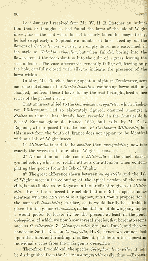 Schon in der Erstbeschreibung schildert Stainton (1884) sehr detailliert die Lebensweise der Raupe an bzw. in Limonium vulgare auf der Isle of Wight in Großbritannien. Auch Walsingham (1891: 1) erhielt von dort Raupen an dieser Pflanze.