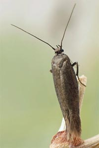 Anscheinend noch unbekannt! Bengtsson (1984) schrieb: The larva is recorded as living on Origanum vulgare L. in spring (Schütze 1931, and others). No description of the larva has been published. Swedish records imply a different hostplant as Origanum does not grow in the known finding places. Adults appear at the end of June to mid July in stony or gravellary, sunny places, sparcely covered with Hippophae, Salix spp., Poaceae, mosses and lichens and other trivial plants confined to dry, coastal places." Die Angabe zu Dost (Origanum) findet sich schon bei Meess (in Spuler 1910), woher die - wahrscheinlich unzutreffende - Angabe stammt, bleibt letztendlich ungeklärt.
