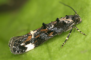 Mompha conturbatella: Kopf und Thorax mehr oder weniger dunkelgrau bis fast schwarz. Bei helleren Farbvarianten fallen drei schwarze Schuppenbüschel auf, zwei in Thoraxmitte, einer am Thorax-Hinterrand.