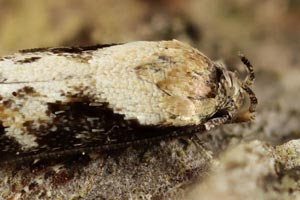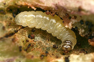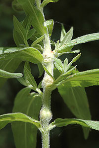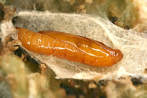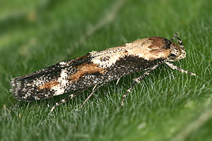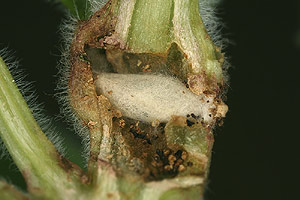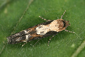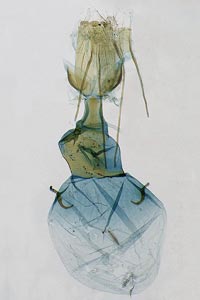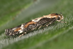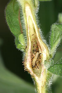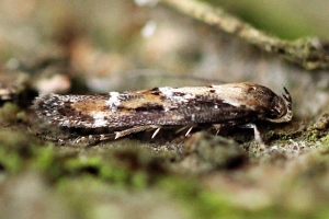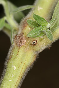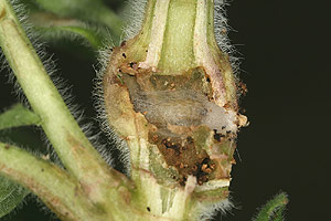 von Heyden (1861: 37-38) hatte geschrieben: "Die Raupe lebt in einer mehr oder weniger gerundeten, gallenartigen Anschwellung bis zu der Grösse einer Erbse, am Stengel des Epilobium alpinum, gewöhnlich an der Basis der Blattstiele. Oft finden sich mehrere Gallen an einem Stengel. In einer länglichen, pergamentartigen, weisslichen Hülle geht die Verwandlung in dem sehr engen Räume der Galle vor sich. An der Oberseite der Galle steht aus einem kleinen Loch röhrenartig etwas weisses Gespinnst vor, aus dem die entwickelte Motte ausschlüpft. Eine Mitte October bei Auerbach an der Bergstrasse gefundene Galle lieferte schon am folgenden Tag die Motte, die jedoch wahrscheinlich in zwei Generationen auch um Frankfurt und im Taunusgebirge vorkommt. Ich werde die Beschreibung der Raupe später liefern. (1860.)"