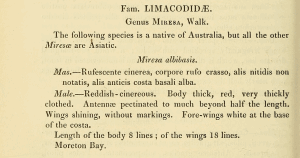 - Original description: Walker, F. (1862): Characters of undescribed Lepidoptera in the Collection of W. W. Saunders, Esq., F.R.S., &c. — The Transactions of the Entomological Society of London. Third series 1: 263-279.