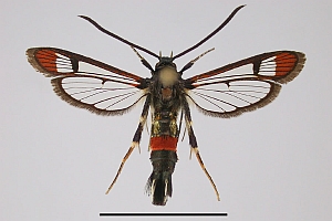 "Bei S. myopaeformis und den anderen rotgeringten Arten lässt sich von oben betrachtet das Geschlecht leicht bestimmen wenn man die Segmente zwischen dem rotem Ring und dem Afterbusch zählt: 2 Segmente = Weibchen; 3 Segmente = Männchen.