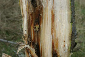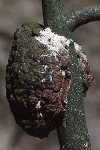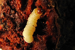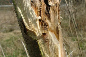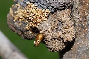 ![]() | Bohrmehl feinkörnig, fast mehlig = Cryptorhynchus lapathi (Bunter Erlenrüsselkäfer) [Larvenfund in Krebsgalle] |