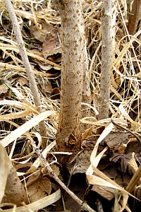 Der Zwerg-Holunder (Sambucus ebulus) gehört zwar wie Viburnum zur Familie der Geißblatt-Gewächse (Caprifoliaceae), scheidet aber schon deshalb als Raupennahrung von S. andrenaeformis aus, weil er praktisch nicht verholzt und im Winter oberflächlich abstirbt, also unmöglich eine in Ästen lebende, mehrjährige Raupe beherbergen kann. Die im Gebiet häufigen verwandten Arten, der Schwarze und der Trauben-Holunder (Sambucus nigra und S. racemosa) sind dagegen echte, stark verholzende Sträucher. Dennoch fahndeten wir auch an ihnen völlig vergeblich nach Schlupflöchern von S. andrenaeformis."