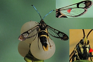 Merkmale zur Unterscheidung zwischen Synanthedon loranthi und Synanthedon cephiformis nach Lastuvka & Lastuvka: „Gelber Aussenrand des basalen Gliedes der Vorderbeine (Vordercoxa) vor dem Gelenk endend und Diskalfleck der HF sehr schmal, an der Mittelader endend„ Text: Daniel Bartsch.