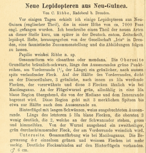• Erstbeschreibung: Ribbe, C. (1900): Neue Lepidoptern aus Neu-Guinea. — Insekten-Börse 17 (39): 308.